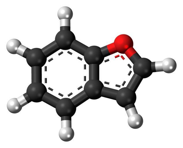 | Keywords: Benzofuran-3D-balls.png Ball-and-stick model of the benzofuran molecule an oxygen heterocycle and a simple aromatic ring Colour code 505050 Carbon C black<br> F0F0F0 Hydrogen H white<br> F51E1E Oxygen O red<br> 2011-02-10 own DS Visualizer Jynto talk Space-filling version cc-zero Benzofuran Images by Jynto Ball-and-stick models |