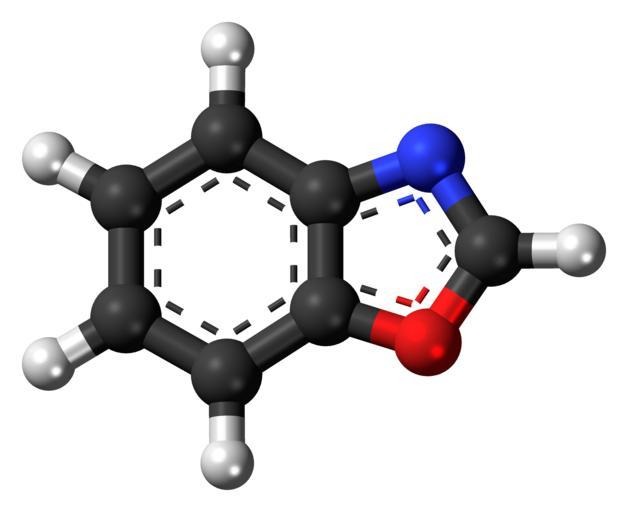| Keywords: Benzoxazole-3D-balls.png Ball-and-stick model of the benzoxazole molecule a nitrogen-oxygen heterocycle and a simple aromatic ring Colour code 505050 Carbon C black<br> F0F0F0 Hydrogen H white<br> F51E1E Oxygen O red<br> 3C50FA Nitrogen N blue<br> 2011-02-10 own DS Visualizer Jynto talk Space-filling version cc-zero Benzoxazole Images by Jynto Ball-and-stick models |