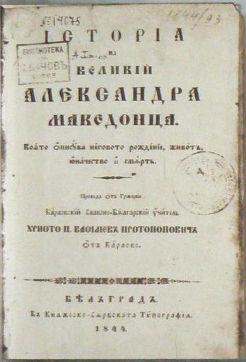 Keywords: Berkovitsa-IVHM-Istoria-Velikii-Aleksandra-Makedontsa.jpg Исто ия на Великий Александ а акедонца от Х исто Василев П отопопович отпечатана в Белг ад п ез 1844 година съх анявана в къщата-музей Иван Вазов в Бе ковица Бълга ия History of the Great Alexander of Macedonia by Hristo Vasilev Protopopovich published in Belgrad 1844 kept in the house-museum of Ivan Vazov in Berkovitsa Bulgaria Self-taken photo of a material in the public domain due to its age Photo 13 July 2008 Cover 1844 year Vassia Atanassova - Spiritia PD-old House-museum Ivan Vazov Berkovitsa Literature of Bulgaria 1844 books Alexander the Great |