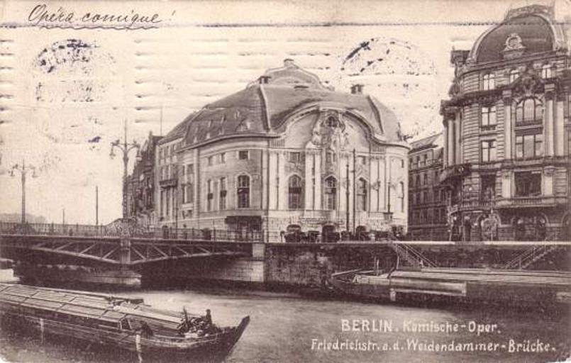 | Keywords: Berlin Komische Oper Weidendammer Brücke.jpg Diese historische Postkarte zeigt die Komische Oper an Weidendammer Brücke Friedrichstraße Dieser Bau hat nichts mit der heutigen Komischen Oper Behrenstraße/Glinkastraße/Unter den Linden zu tun die seit 1947 den Zuschauerraum des ehemaligen Metropol-Theaters errichtet 1892 als Theater unter den Linden benutzt und nach dem Zweiten Weltkrieg ein moderne Außenhülle erhielt This is an old postcard showing the former Komische Oper in Berlin at Friedrichsstrasse/Weidendammer Brücke It is not today's Komische Oper in Behrenstraße/Glinkastraße which was built using remains of the former Metropol-Theater built 1892 as Theater unter den Linden own scan; http //www andreas-praefcke de/carthalia/germany/berlin_komischeoper_weidendammer htm circa 1905 “1910 anonymous Anonymous-EU PD-1923 Alte Komische Oper Berlin Black and white photographs of bridges Iron truss arch bridges Weidendammer Brücke Postcards of Friedrichstraße Barges of Germany 1905 in Berlin Images from Carthalia |