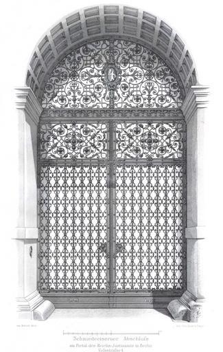 | Keywords: Berlin Reichsjustizamt Vossstrasse 4 AS.jpg en Berlin -Wrought iron gate of the Reichsjustizamt Voßstraße 5 de Berlin - schmiedeisernes Tor am Portal des Reichsjustizamtes Voßstraße 5 Architektonisches Skizzenbuch Heft 1 1885 Blatt 6 1885 Mörner PD-old Reichsjustizamt building Wrought iron gates in Berlin Mörner family |