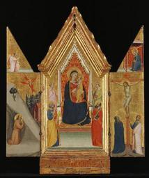 | Keywords: Bernardo Daddi - Madonna and Child Enthroned with Saints - 34.20 - Minneapolis Institute of Arts.jpg Religion NT Triptych center panel gabled; wings together form gable Madonna and Child with Paul Peter Catherine and Helena Francis Miracles Stigmatization of Francis in retreat on Mount Alverna Annunciation Mary usually reading is visited by the Angel Crucified Christ with Mary and John the Evangelist Central panel Madonna and Child enthroned; the child stands in his mother's lap facing her his arms extended; the Virgin looks at him with a half smile; she wears a red lined blue mantel over a dark red gown; back of throne decorated with slender arabesques on scarlet ground; to left of throne stands St Helen and St Peter to the right St Catherine and St Paul; the colors of their robes are ivory rose mauve gold dull green; gold leaf background; left wing St Francis Receiving the Stigmata; dull mauve robe; angel's drapery scarlet; gold background; right wing Crucifixion; Mary in black standing at foot of cross; gold leaf background; Pinnacles The Annunciation Virgin's robe black against scarlet background with decorative motifs of throne angel diaphanous rose drapery against gold leaf background; panels bordered with incised motif haloes bear incised decoration; gold background brilliant colors fresh 23 3/8 x 19 15/16 x 1 7/8 in 59 42 x 50 64 x 4 76 cm 23 3/8 x 10 x 1 7/8 in 59 37 x 25 4 x 4 76 cm panel center 18 11/16 x 5 x 7/8 in 47 47 x 12 7 x 2 22 cm panel right 18 9/16 x 4 15/16 x 7/8 in 47 15 x 12 54 x 2 22 cm panel left 34 20 https //api artsmia org/images/10448/4217/large jpg Q1700481 Tempera and gold ground on poplar panel Madonna and Child Enthroned with Saints https //collections artsmia org/index php page detail id 10448 Q20891438 |
