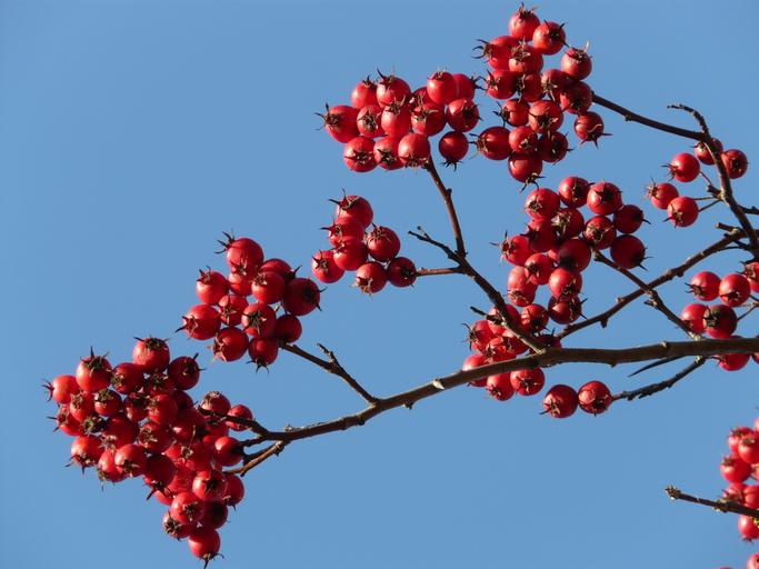 Keywords: berries fruits red tree berry red leather leaf weißdorn thorn apple crataegus hawthorn crataegus crus weißdorn crataegus crus galli valve thorn blue sky fruit jewelry