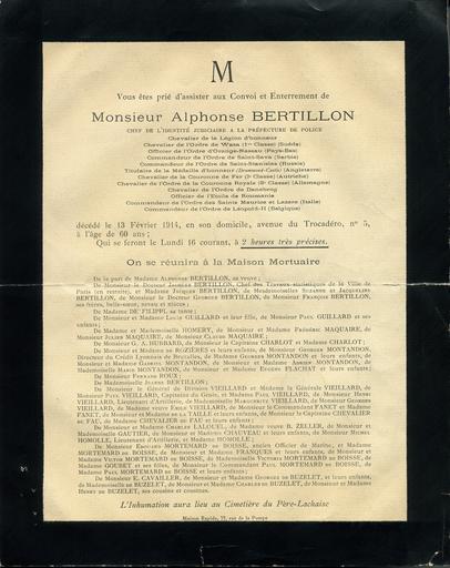 | Keywords: Bertillon faire part de deces.jpg Alphonse Bertillon février 1914 Alphonse Bertillon feb 1914 2011-06-08 17 56 00 Courtesy of the current Head of the Identité Judiciaire de Paris Maison Rapide 72 rue de la Pompe Paris other versions PD-old-100 Uploaded with UploadWizard Alphonse Bertillon Faire-part 1914 documents Alphonse Bertillon Faire-part for his funerals 18 29 4 January 2015 UTC Bertillon faire part de deces jpg | ||||