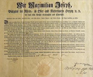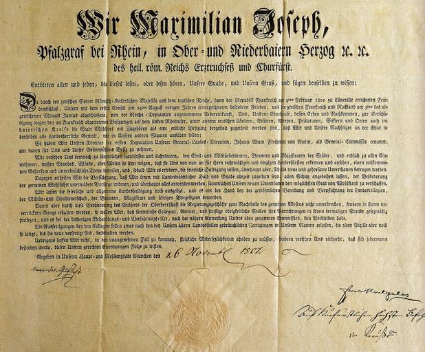 Keywords: Besitzergreifungspatent Mühldorf.jpg Besitzergreifungspatent für Mühldorf November 1802 Orginal liegt im bayerischen Hauptstaatsarchiv in München Urkunde Ausgestellt auf den 26 November 1802 Johann Adam Freiherr von Aretin 1769-1822 PD-old History of Mühldorf am Inn Aretin family 1802 documents |