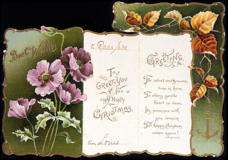 Keywords: text writing document Shows mauve anemones on the left, and autumn leaves around the border, at right. In the centre is a short verse: Greeting: The sweet and gracious time is her / To every gentle heart so dear, / Its promise with you remain / Till happy Christmas comes again!. Quantity: 1 colour art print(s) on Christmas greetings card. Physical Description: Chromolithograph, on opened card, 142 x 205 mm. Best wishes. To greet you for a right happy Christmas. [Card, open. 1900-1910?]. Various artists :[Box of assorted Christmas cards. 1860s-1919]. Ref: Eph-A-CARDS-Christmas-1900/1910-01-open. Alexander Turnbull Library, Wellington, New Zealand. natlib.govt.nz/records/23019551 Shows mauve anemones on the left, and autumn leaves around the border, at right. In the centre is a short verse: Greeting: The sweet and gracious time is her / To every gentle heart so dear, / Its promise with you remain / Till happy Christmas comes again!. Quantity: 1 colour art print(s) on Christmas greetings card. Physical Description: Chromolithograph, on opened card, 142 x 205 mm. Best wishes. To greet you for a right happy Christmas. [Card, open. 1900-1910?]. Various artists :[Box of assorted Christmas cards. 1860s-1919]. Ref: Eph-A-CARDS-Christmas-1900/1910-01-open. Alexander Turnbull Library, Wellington, New Zealand. natlib.govt.nz/records/23019551 |