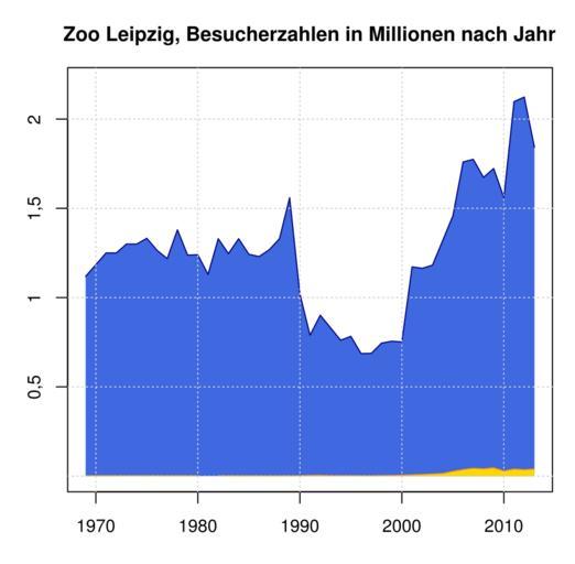 | Keywords: Besucher.svg de Besucherzahlen des Zoo Leipzig Blau Gesamtbesucherzahlen Orange Besucher mit Jahreskarte 2011-06-30 own Accountalive Erzeugt durch folgendes R-Skript <pre>zoo <- matrix c 1969 1119000 1560 1971 1250000 1623 1972 1250000 1624 1973 1300000 1810 1974 1300000 1700 1975 1332194 1654 1976 1264726 1948 1977 1218617 1407 1978 1380000 1700 1979 1238000 1324 1980 1240000 1388 1981 1130000 NA 1982 1330000 1367 1983 1246500 1316 1984 1330000 1183 1985 1243000 1007 1986 1230000 998 1987 1268000 944 1988 1330000 924 1989 1560000 1075 1990 1021293 1580 1991 789272 3254 1992 901496 3790 1993 831426 2270 1994 761563 1979 1995 782951 1954 1996 686731 1501 1997 687398 1382 1998 744749 2147 1999 755736 2829 2000 751619 4227 2001 1172158 6392 2002 1164392 8546 2003 1181535 11122 2004 1319767 14000 2005 1457938 25616 2006 1759963 35554 2007 1774587 42854 2008 1673608 39515 2009 1723349 45209 2010 1560791 27553 2011 2098075 38732 2012 2123349 34701 2013 1842000 39024 ncol 3 byrow TRUE jahr zoo 1 besucher zoo 2 dauerticket zoo 3 par mar c 3 2 3 3 1 fontscale 0 7 Leerer Plot zwecks Einstellungen alle am selben Ort etc plot jahr besucher ylim c 0 2200000 type l col NA xlab ylab main Zoo Leipzig Besucherzahlen in Millionen nach Jahr yaxt n cex main 8 cex axis fontscale y<-c 0 5 1 1 5 2 1e6 axis 2 at y labels formatC y/1e6 big mark format fg decimal mark cex axis fontscale Als Flaechen polyX c jahr max jahr min jahr polyBesucher c besucher 0 0 polygon polyX polyBesucher col royalblue border NA Ohne Fehlende Werte zooDauer matrix zoo is na zoo 3 ncol 3 jahrDauer zooDauer 1 dauerticket zooDauer 3 polyXDauer c jahrDauer max jahrDauer min jahrDauer polyDauerticket c dauerticket 0 0 polygon polyXDauer polyDauerticket col gold border NA lines jahr besucher type l col navy lines jahr zoo 3 type l col orange grid </pre> cc-zero Uploaded with UploadWizard Leipzig Zoo |