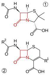 Keywords: Beta-lactam antibiotics example 1.svg Skeletal formulae of the basic structures of penicillin 1 and cephalosporin 2 antibiotics highlighting the beta-lactam ring red Created using http //www acdlabs com/download/chemsk html ACD/ChemSketch 10 0 and Inkscape ;Legend red w Beta-lactam ring Own 2007-10-23 Fvasconcellos 19 02 23 October 2007 UTC Beta-lactam antibiotics |