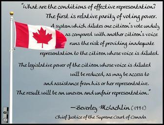 Keywords: beverley mclachlin beverleymclachlin chief justice of the supreme court of canada chiefjusticeofthesupremecourtofcanada quotation representative democracy representativedemocracy 1991 canada attorney general of saskatchewan v. roger carter attorneygeneralofsaskatchewanvrogercarter decision senate hansard effective representation effectiverepresentation text document “What are the conditions of effective representation? The first is relative parity of voting power. A system which dilutes one citizen’s vote unduly as compared with another citizen’s voice runs the risk of providing inadequate representation to the citizen whose voice is diluted. The legislative power of the citizen whose voice is diluted will be reduced, as may be access to and assistance from his or her representative. The result will be an uneven and unfair representation.” — Beverley McLachlin (1991) the current Chief Justice of the Supreme Court of Canada quoted from Attorney General of Saskatchewan v. Roger Carter in Debates of the Senate (Hansard) “What are the conditions of effective representation? The first is relative parity of voting power. A system which dilutes one citizen’s vote unduly as compared with another citizen’s voice runs the risk of providing inadequate representation to the citizen whose voice is diluted. The legislative power of the citizen whose voice is diluted will be reduced, as may be access to and assistance from his or her representative. The result will be an uneven and unfair representation.” — Beverley McLachlin (1991) the current Chief Justice of the Supreme Court of Canada quoted from Attorney General of Saskatchewan v. Roger Carter in Debates of the Senate (Hansard) |