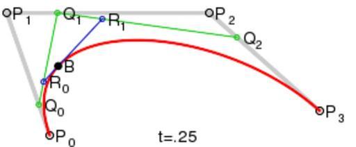 | Keywords: Bezier cubic.png Konstruktion einer kubischen Bézierkurve <math>C_ P_0P_1\ldots P_3 </math> die durch die Punkte <math>P_0</math> <math>P_1</math> <math>P_3</math> bestimmt wird Hierbei ist <math> Q_0 C_ P_0P_1 0 5 </math> <math> Q_1 C_ P_1P_2 0 5 </math> <math> Q_2 C_ P_2P_3 0 5 </math> <math> R_0 C_ Q_0Q_1 0 5 C_ P_0P_1P_2 0 5 </math> <math> R_1 C_ Q_1Q_2 0 5 C_ P_1P_2P_3 0 5 </math> <math> \boldsymbol B C_ R_0R_1 0 25 C_ Q_0Q_1Q_2 0 25 C_ P_0P_1P_2P_3 0 5 </math> Cubic Bézier curve with t 0 5 Constructed with ImageMagick 2006-08-27 Philip Tregoning Released into the public domain Image bezier_cubic_anim gif Bezier Curves |