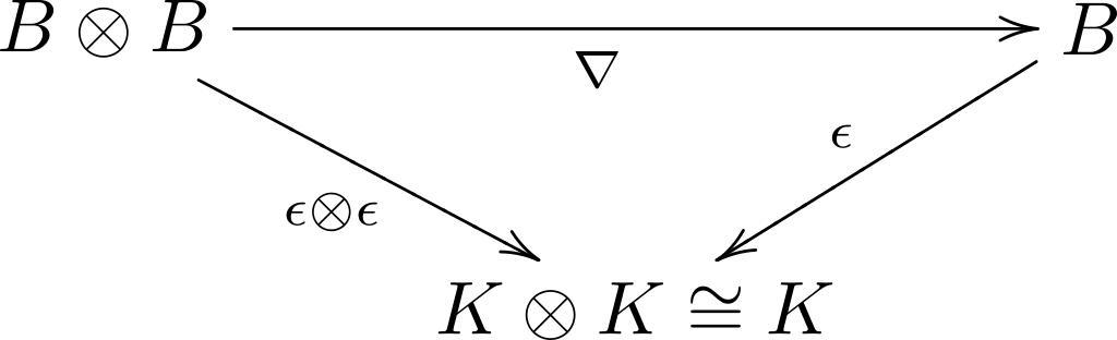 | Keywords: Bialgebra3.svg Created by Dave Rosoff using LaTeX2e and textogif Bialgebra3 png 2010-08-23 06 09 UTC Bialgebra3 png User Alodyne on http //en wikipedia org en wikipedia derivative work Snubcube <span class signature-talk >talk</span> Convert to SVG snubcube Bialgebra3 png LaTeX Source \documentclass article \usepackage xy \xyoption all \begin document \pagestyle empty \ \xymatrix B \otimes B \arrr_\nabla \arrd_ \epsilon \otimes \epsilon B \arld_\epsilon \\ K \otimes K \cong K \\ \ \end document other_versio</nowiki> Uploaded with derivativeFX Binary operations Coalgebra structures Commutative diagrams of binary operations Commutative triangles Images with LaTeX source code |