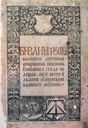 Keywords: Biblia Ruska.jpg Bible cover cyrillic «Библия уска выложена докто ом Ф анциском Ско иною из славного г ада Полоцка Богу ко чти и людем посполитым к доб ому научению» Bible printed by Francysk Skaryna in 1517 Библия напечатанная Ф анциском Ско иной в 1517 Біблія над укаваная Ф анцыскам Ска ынам у 1517 Біблія над укована Ф анциском Ско ином у 1517 circa 1517 1519 in Prague Francysk Skaryna PD-old Holy Bible by Francysk Skaryna Title pages from the Czech Republic |