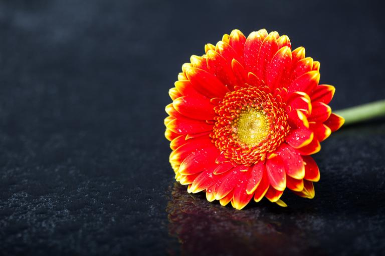 Keywords: bicolor black botany daisy dark flower gerbera low key nature plant portrait red selective focus shallow depth of field shallow dof shallow focus slate spring studio table two water wet yellow