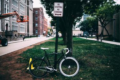 Keywords: bike bicycle sign no stopping no standing sidewalk path buildings city grass trees