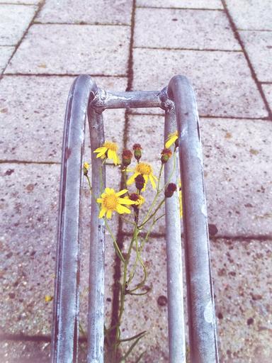 Keywords: bike racks flowers yellow grow sidewalk blossom bloom plant nature close yellow flower flora bright wild flower stone ground turn off
