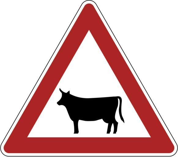 | Keywords: Bild 2h - Tiere, StVO 1956.svg  de Bild 2h Tiere Für den Rotton wurde das RAL-Farbtonregister 840 R gewählt Der dort verzeichnete Rotton RAL 3000 ist in der Abbildung wiedergegeben Zeichen dieser Art wurden bis zur StVO 1970 hergestellt Dann änderte sich der Rotton der Umrandung Verkehrszeichen nach den Vorgaben der StVO in der Fassung vom 29 März 1956 Quelle Bundesgesetzblatt Jahrgang 1956 Nr  19 S  351 Tag der Ausgabe Bonn 29 Mai 1956 own Mediatus 2013-09-02 v Cc-zero PD-VzKat Diagrams of danger warning road signs of Germany 1956 set 02h Cattle-related warning road signs |