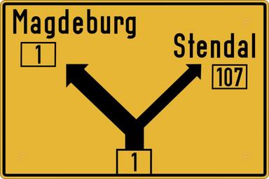 | Keywords: Bild 54 c - Vorwegweiser zu Straßenkreuzungen und Abzweigungen, StVO DDR 1964.svg de Bild 54 c Vorwegweiser zu Straßenkreuzungen und Abzweigungen StVO DDR 1964 Verkehrszeichen der Deutschen Demokratischen Republik nach der Straßenverkehrsordnung StVO von 1964 <br /> Die Ausführung dieses Schildes richtet sich nach den im April 1967 bekanntgegebenen Normen TGL 10629 Blatt 2 Leiteinrichtungen für den Straßenverkehr “ Verkehrszeichen “ Schilder und TGL 10629 Blatt 3 Leiteinrichtungen für den Straßenverkehr “ Verkehrszeichen “ Symbole Farbe Schrift Die Farbgrenzen werden deffiniert nach der im Februar 1967 bekanntgegebenen Norm TGL 20684 Blatt 6 Signallichter “ Farben und Farbgrenzen im Verkehrs “ Ortsfeste Signallichter im Straßenverkehr Alle zwei genannten Normen wurden am 01 01 1968 verbindlich TGL 20684 Blatt 6 war ein Ersatz für die ältere Norm TGL 06163 vom November 1962 die bei Einführung der StVO von 1964 galt Damals hatte es noch keine durch die CIE-Normfarbtafel festgelegten Farbgrenzen gegeben Die normierten Bohrlöcher im Schild nach TGL 10629 Tabelle 2 sind behördlich vorgeschrieben und daher unverzichtbarer Bestandteil bei diesen Verkehrszeichen und werden somit in der Abbildung wiedergegeben Anwendung fand bei der Einführung dieser StVO noch die Typfarbkarte 5/62 und ab dem 01 10 1969 die verbindlich eingeführte Farbkarte nach TGL 21196 TGL 21196 vom Januar 1969 Anstrichstoffe “ Farbregister Typfarbkarte 5/62 Rot 3000 RAL-Farbtonregister 840 R 3000 TGL 21196 1969 0605 žSignalrot Lab L 44 78 a 50 80 b 26 62 Zur CIELab-Umwandlung siehe TGL 21196 Juni 1987 Anstrichstoffe “ Farbregister “ Vorzugsfarben own Mediatus 03 März 2016 Herstellungsdatum other fields + Signs User Mediatus/no-new-version Cc-zero PD-Vz historisch SVG road signs in East Germany 54c svg Diagrams of direction road signs of East Germany 1964 set 54c svg |