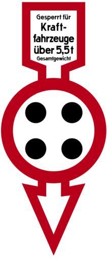 | Keywords: Bild 62 - Gesperrt für Kraftfahrzeuge über 5,5 Tonnen Gesamtgewicht, StVO 1937.svg  de Bild 62 Gesperrt für Kraftfahrzeuge über 5 5 Tonnen Gesamtgewicht Verkehrszeichen nach dem Reichsgesetzblatt 123 vom 16 November 1937 S 1212 Auch identisch in R Allmers R Kaufmann C Fritz E Kleinrath E H Pflug Hrsg Das deutsche Automobilwesen der Gegenwart Reimar Hobbing Berlin 1928 S 219 Die Typographie wurde von einem historischen Vorbild übernommen Die Bemaßung entspricht den damaligen Vorgaben Das Schild war insgesamt 1200 mm hoch Der Kreisdurchmesser hatte 500 mm der der dort einzusetzenden Punkte 100 mm Der Pfeil war oben und an den Pfeilenden 300 mm breit seine Umrandung war mit 40 mm etwas schmäler als die des Kreises own selbst gezeichnet von Mediatus Mediatus 26 Dezember 2013 Herstellungsdatum Cc-zero PD-VzKat German language signs Diagrams of historic road signs of Germany 1929 set Diagrams of miscellaneous road signs of Germany 1934 set Diagrams of deprecated road signs of Germany 1938 set 62 SVG road signs in Germany |