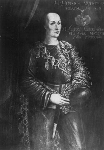 | Keywords: Bildnis des Lübecker Ratsherrn Heinrich Westfal (1496).jpg <s>Bildnis des Dr Anton Köhler 1542-1657 Als Bürgermeister in den Rat gewählt 1642 jpg</s> Der Lübecker Ratsherr Heinrich Westval im mittelalterlichen Schellenkostüm Bildnis um 1640 nach einer älteren Vorlage http //www bildindex de/ 1700 author PD-Art-100 Köhlersche Ahnengalerie 15th-century senators of Lübeck 16th-century senators of Lübeck 1505 deaths | ||||