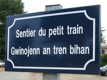Keywords: Bilingual cycle route sign Carhaix.jpg Bilingual sign at start of cycle route along former railway from Carhaix to Douarnenez Brittany Own 2007-08-17 Man vyi Bilingual Breton-French road signs Réseau Breton Rail trails in France Cycling route signs in France |