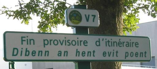 Keywords: Bilingual cycle route sign end Carhaix.jpg Bilingual sign at start of cycle route along former railway from Carhaix to Rosporden Brittany Own 2007-08-18 Man vyi Bilingual Breton-French road signs Réseau Breton Cycling route signs in France Rail trails in France |