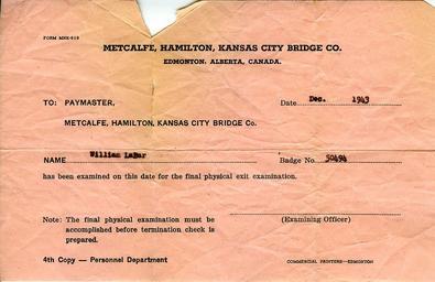 | Keywords: metcalfe, hamilton, kansas city bridge company metcalfehamiltonkansascitybridgecompany peace river bridge peaceriverbridge alaska highway alaskahighway bridge alcan highway alcanhighway document text Bill changed jobs to work on the Peace River Bridge, evidently for the Metcalfe, Hamilton, Kansas City Bridge Company (MHKCBCo). This form was probably the one he needed before he could return home for the first time in nine months. His final letter to Helen from that period was written before he boarded the train home from Edmonton, Alberta. There was great meaning in what he wrote at the top of that letter: "On the Way, Dec 10, 1943." Bill changed jobs to work on the Peace River Bridge, evidently for the Metcalfe, Hamilton, Kansas City Bridge Company (MHKCBCo). This form was probably the one he needed before he could return home for the first time in nine months. His final letter to Helen from that period was written before he boarded the train home from Edmonton, Alberta. There was great meaning in what he wrote at the top of that letter: "On the Way, Dec 10, 1943." |