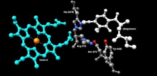 | Keywords: Binding Site of Ubiquinone.JPG en Ubiquinone ™s binding site is located in gap comprised of SdhB SdhC and SdhD Ubiquinone is stabilized by the side chains of His207 of subunit B Ser27 and Arg31C of subunit C and Tyr83 of subunit D These side chains are shown in grey Nitrogens are blue and oxygens are red Ubiquinone is shown in white and the heme group aqua is also shown Tyr83 forms an additional hydrogen bond to Arg31 of subunit C which allows a proton to directly translocate from the Tyr83 to ubiquinone when it is reduced The quinone ring is surrounded by Ile28 of subunit C and Pro160 of subunit B These residues along with Ile209 Trp163 Trp164 of subunit B and Ser27 of subunit C form the hydrophobic environment of the quinone-binding pocket not shown in the image Adamandalex created this work entirely by himself/harself The file was created from 2acz Original uploader was Adamandalex at http //en wikipedia org/ en wikipedia 19 08 13 December 2008 Adamandalex Succinate dehydrogenase Ubiquinone |
