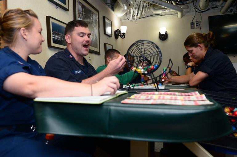 Keywords: Bingo night 141022-N-GW918-016.jpg en Cryptologic Technician-Technical 2nd Class Kees Sharp calls numbers in a Morale Welfare and Recreation MWR sponsored Bingo night aboard the Ticonderoga-class guided-missile cruiser USS Bunker Hill CG 52 Bunker Hill is deployed as part of the Carl Vinson Carrier Strike Group supporting maritime security operations strike operations in Iraq and Syria as directed and theater security cooperation efforts in the U S 5th Fleet area of responsibility U S Navy photo by Mass Communication Specialist 1st Class LaTunya Howard/Released 2014-10-22 Petty Officer 2nd Class LaTunya Turner Howard https //www dvidshub net/image/1651214 141022-N-GW918-016 2014-11-10 19 37 USS BUNKER HILL AT SEA PD-USGov-Military-Navy USS Bunker Hill CG-52 Images from DoD uploaded by Fæ