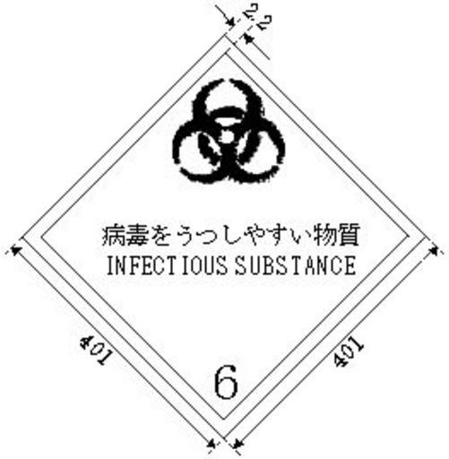 Keywords: BiohazardSymbolTransportJapanDia6.jpg ja 日 で輸 する際に用いるバイオハザードマーク(国 の菱形標識) en UN Infectious Substances Dia symbol of Biohazard Symbol on Transporting in Japan 特定病原体等の運搬に係る容器等に関する基準 平成十 年六 日厚生労働 告示第二百 号 Stanadard packaging of specific pathogens Administrative Notice Japanese Ministry of Health Labour and Welfare Heisei-19 209 http //wwwhourei mhlw go jp/cgi-bin/t_document cgi MODE hourei DMODE CONTENTS SMODE NORMAL KEYWORD EFSNO 417 PAGE 0 FILE POS 0 HITSU 0 厚生労働 Japanese Ministry of Health Labour and Welfare 2007-06-01 PD-Japan-exempt symbol Biohazard symbols ADR 6 2-JP ADR images 6 2 |