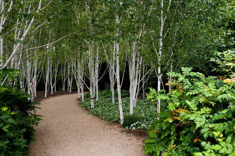 Keywords: birch trees white barked grouped mahonia in foreground pulmonaria gravel path angelsey abbey cambridgeshire