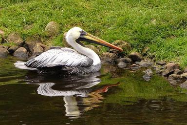Keywords: bird large pelikan large beak water mirror image