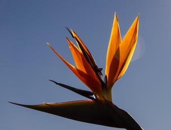 Keywords: bird of paradise flower flower petals sun lit garden yellow blue strelitzia blossom bright exotic