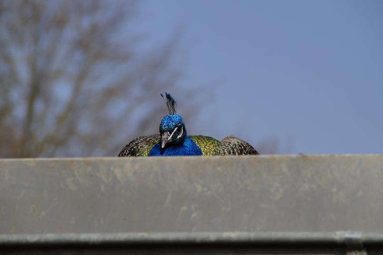 Keywords: bird peacock males close crouch roof duck hidden