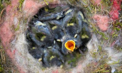 Keywords: bird's nest chicks tit bill nest feeding hungry bird fly feed animals nature small bird plumage cute sitting songbird yellow birds hunger bird breeding young birds babies hatching eat small young orange signal colour