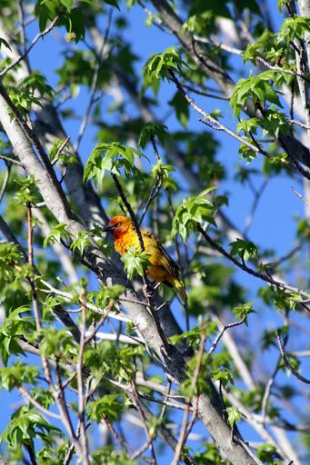Keywords: bird yellow red nature wild green summer tree natural environment feather rural