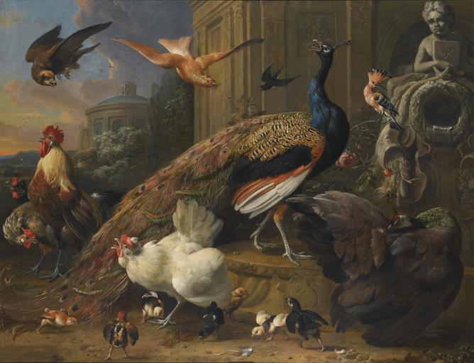 | Keywords: Birds disturbed by a falcon.jpg Artwork en A peacock and peahen together with a cockerel and other poultry a swallow pigeon and hoopoe beside a fountain in a garden all disturbed by the arrival of a falcon oil on canvas Size cm 137 1 168 2 Gustav Henrik Vilhelm Upmark Die Architektur der Renaissance in Schweden 1530-1760 1900 p 125 Inv A2325 Exhibited Berlin Staatliche Museen Melchior d'Hondecoeter 1636-1695 18 September 2010 - 2 January 2011 no 38 object history Anonymous sale London Sotheby's 8 December 1965 lot 76 for £2 600 to Spiller; With W H Patterson London December 1999; With Richard Green London; by 2013-12-04 acquisition Private collection Richard Green dealer London ProvenanceEvent 2013-12-04 sale unsold Private collection Sotheby's London 37 Melchior d'Hondecoeter exhibition history credit line accession number place of creation http //www sothebys com/fr/auctions/ecatalogue/2013/old-master-british-paintings-evening-l13036/lot 37 html PD-old-100 Uploaded with UploadWizard Paintings by Melchior d'Hondecoeter |