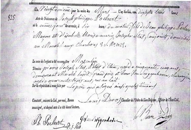 | Keywords: Birth certificate Poelaert 1817.jpg fr Certificat de naissance le 21 mars 1817 de l'architecte Joseph Poelaert à Bruxelles copie du certificat de naissance de Joseph Poelaert scannage personnel 1817 Joseph Poelaert PD-old-100 19th-century birth certificates Birth certificates of Belgium |