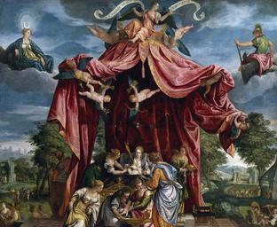 | Keywords: Birth of Ferdinand, Prince of Asturias.jpg Artwork Creator Parrasio Micheli This painting describes in an allegorical way the birth of Ferdinand the son of Philip II of Spain circa 1575 oil on canvas cm 128 223 Institution Prado Madrid Prado Museum Official Website <small> See below </small> object history langSwitch Alegoría del nacimiento del infante don Fernando hijo de Felipe II representado en un niño rodeado de siete damas las Virtudes teologales y las cardinales delante de un lecho donde yace una dama alusiva a su madre Ana de Austria en un esquema compositivo basado en los nacimientos religiosos La escena está enmarcada por un gran cortinaje sujeto por siete putti y sobre el cual se asienta la Fama tocando la trompeta y portando un rótulo con la leyenda celebris mundi veneris partus Se celebra en el mundo el parto de Venus A los lados sobre nubes y acompañados de un águila aparecen Lucina la diosa romana de los partos y Marte el dios romano de la guerra Allegory of the birth of the Infante Ferdinand son of Philip II represented as a child surrounded by seven women the theological and cardinal virtues in front of a bed on which there is a lady alluding to his mother Anne of Austria in a compositional scheme based on a religious birth The scene is framed by a large curtain of seven putti subject and on which rests the fame playing the trumpet and holding a sign with the legend Celebris veneris partus mundi takes place in the world the birth of Venus On the sides on clouds and accompanied by an eagle displayed Lucina the Roman goddess of childbirth and Mars the Roman god of war credit line accession number P00479 http //www museodelprado es/coleccion/galeria-on-line/galeria-on-line/obra/alegoria-del-nacimiento-del-infante-don-fernando-hijo-de-felipe-ii/ Prado Museum Online Gallery PD-old-100 Uploaded with UploadWizard Parrasio Micheli Anna of Austria 1549-1580 Ferdinand Prince of Asturias Heirs apparent who never acceded 16th-century allegorical paintings Lucina goddess Paintings of Mars Putti |