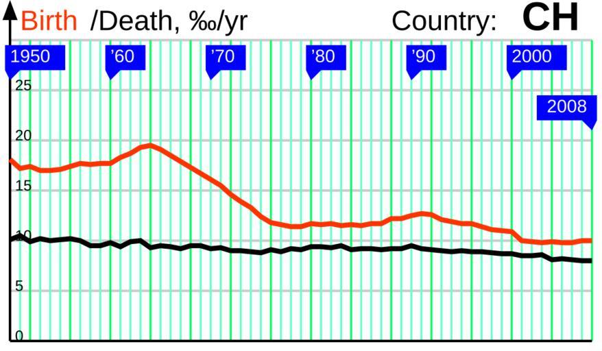 | Keywords: BirthDeath 1950 CH.svg en The birth and death rates in Switzerland 1950 2008 ru Π ΠΎΠΆΠ΄Π°Π΅ΠΌΠΎΡΡΡ ΠΈ ΡΠΌΠ΅Ρ ΡΠ½ΠΎΡΡΡ Π² Π¨Π²Π΅ΠΉΡΠ°Ρ ΠΈΠΈ 1950 2008 own Incnis Mrsi 2009-07-14 public domain File RNI 1950 CH svg Disclaimer The author of this graph gives no warranty and accepts no responsibility for its factual accuracy This graph is nothing but a visualization of data from http //demoscope ru/weekly/ias/ias05 php tim 0 cou 37 terr 1 ind 26 Submit OK http //demoscope ru/weekly/ias/ias05 php tim 0 cou 37 terr 1 ind 1 Submit OK which may be incomplete or error-prone If you find an error please correct the data in a <path d ¦ /> tag adding some comments about your reliable source and upload the file over Demographics of Switzerland Birth and death rates |