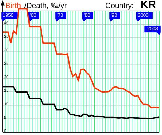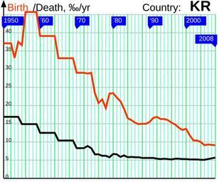 | Keywords: BirthDeath 1950 KR.svg  en The birth and death rates in the Republic of Korea own Incnis Mrsi 2009-07-13 public domain File RNI 1950 KR svg Disclaimer The author of this graph gives no warranty and accepts no responsibility for its factual accuracy This graph is nothing but a visualization of data from http //demoscope ru/weekly/ias/ias05 php tim 0 cou 16 terr 1 ind 26 Submit OK http //demoscope ru/weekly/ias/ias05 php tim 0 cou 16 terr 1 ind 1 Submit OK which may be incomplete or error-prone If you find an error please correct the data in a <path d ¦ /> tag adding some comments about your reliable source and upload the file over Demographics of the Republic of Korea Birth and death rates |