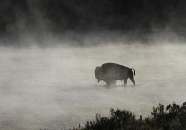 Keywords: bison buffalo bull wildlife nature yellowstone national park wyoming usa winter river steam landscape wilderness wild mammal outdoors