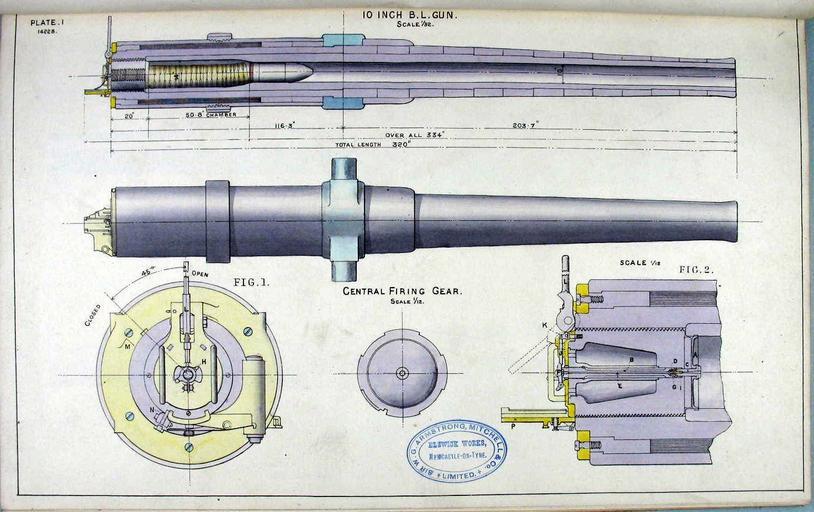 | Keywords: BL 10 inch 30 calibre Armstrong gun diagrams.jpg Diagrams showing barrel and breech mechanism of Armstrong 10-inch 30 calibre rifled breechloading naval gun as purchased by Australian colony of Victoria Plate I in Instructions For 10 Inch Rifled Breech Loading Armstrong Gun and Automatic Naval Carriage And Slide <br>Downloaded from National Archives of Australia http //recordsearch naa gov au/scripts/Imagine asp B 4039832 circa 1880 s Armstrong Mitchell Elswick Works PD-Old Gun barrels BL 10 inch Gun breeches BL 10 inch Elswick Ordnance Company Naval guns of the United Kingdom 254 mm artillery |