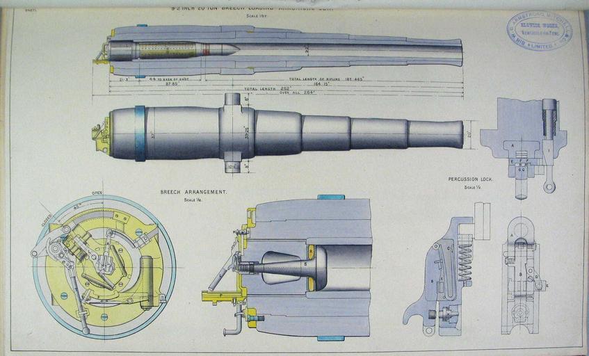 | Keywords: BL 9.2 inch Mk I - II gun diagrams.jpg Diagrams depicting barrel and breech mechanism of Armstrong 9 2 inch 25 5 calibre coast defence gun Instructions for 9 2 inch Breech Loading Armstrong Gun and Automatic Barbette Centre Pivot Mounting <br>Downloaded from National Archives of Australia http //recordsearch naa gov au/scripts/Imagine asp B 4039831 circa 1880 s Armstrong Mitchell Elswick Works PD-Old BL 9 2 inch gun Mk I - VII Gun barrels BL 09 2 inch gun Mk 01 De Bange breech BL 09 2 inch gun Mk 01 |