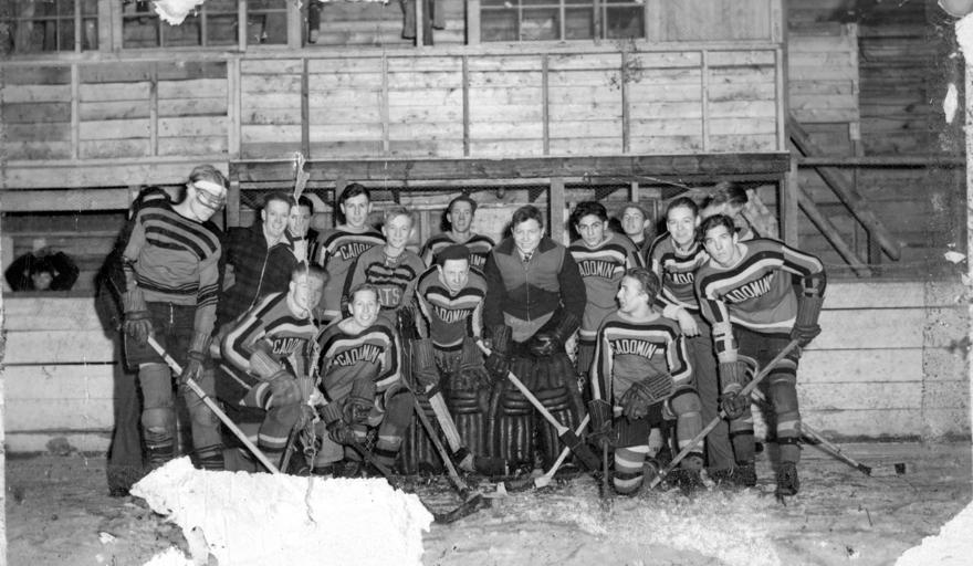| Keywords: hockey alberta ice hockey icehockey blackandwhite monochrome outdoor black and white Cadomin, Alberta. Back row (left to right): Henry Gralon (behind hockey player), Alex Matheson, Frank Popowich, Henry Kwisney, Jack Chambers, Louie Joy, Frankie Brown, Dixon MacKinnon, Ted Dombroski, Raymond Reston. Front row (left to right): Sydney MacLeod, Jack Chesney, Ryse Morgan, Bill (Windy) Shearer, Steve (Bingo) Merluck, Ray Reston. 1938, A15157. Cadomin, Alberta. Back row (left to right): Henry Gralon (behind hockey player), Alex Matheson, Frank Popowich, Henry Kwisney, Jack Chambers, Louie Joy, Frankie Brown, Dixon MacKinnon, Ted Dombroski, Raymond Reston. Front row (left to right): Sydney MacLeod, Jack Chesney, Ryse Morgan, Bill (Windy) Shearer, Steve (Bingo) Merluck, Ray Reston. 1938, A15157. |