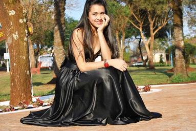 Keywords: black dress smile prom dress fashion walking seated woman female brown dark hair long dress outdoors girl bella