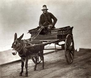 Keywords: street life in london streetlifeinlondon black jack blackjack donkey cart coster costermonger vehicle monochrome From 'Street Life in London', 1877, by John Thomson and Adolphe Smith: "Jack stood charged with cutting and wounding the donkeys with a heavy flail-like instrument. At the request of the magistrate the instrument was put in as evidence. It was produced by the defendant from the depths of a side pocket, and proved to be a switch of about eighteen inches in length. "This is the flail, your honour," said I, “and I own I use it for tickling Tom and Billy, my donkeys. They want no more to make 'em fly." The case was dismissed. Jack left the court with a clear conscience and an unblemished name among costers; for, although some of them may neglect their wives and families, it seems to be a point of honour with all to treat their donkeys with kindness. For the kindness bestowed the animal invariably shows its gratitude by perfect docility and willingness to bear the yoke imposed by its master. The donkeys fare like their own masters; a prosperous day will secure for them some dainty, or at least a feed without stint, of oats, beans, and hay, at a cost of eightpence or ninepence." For the full story, and other photographs and commentaries, follow this link and click through to the PDF file at the bottom of the description archives.lse.ac.uk/Record.aspx?src=CalmView.Catalog&i... From 'Street Life in London', 1877, by John Thomson and Adolphe Smith: "Jack stood charged with cutting and wounding the donkeys with a heavy flail-like instrument. At the request of the magistrate the instrument was put in as evidence. It was produced by the defendant from the depths of a side pocket, and proved to be a switch of about eighteen inches in length. "This is the flail, your honour," said I, “and I own I use it for tickling Tom and Billy, my donkeys. They want no more to make 'em fly." The case was dismissed. Jack left the court with a clear conscience and an unblemished name among costers; for, although some of them may neglect their wives and families, it seems to be a point of honour with all to treat their donkeys with kindness. For the kindness bestowed the animal invariably shows its gratitude by perfect docility and willingness to bear the yoke imposed by its master. The donkeys fare like their own masters; a prosperous day will secure for them some dainty, or at least a feed without stint, of oats, beans, and hay, at a cost of eightpence or ninepence." For the full story, and other photographs and commentaries, follow this link and click through to the PDF file at the bottom of the description archives.lse.ac.uk/Record.aspx?src=CalmView.Catalog&i...