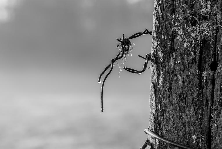 Keywords: black and white fence post wood old rustic wire metal tree bark