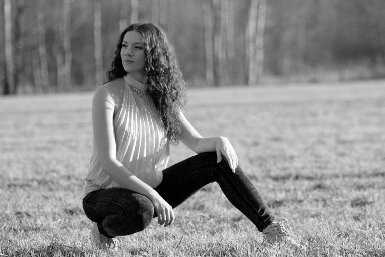 Keywords: black and white photo for a change katrin pozuje outdoors meadow girl hair one woman lady elegance light face eyes interesting sunny spring is coming satisfaction thoughtfulness