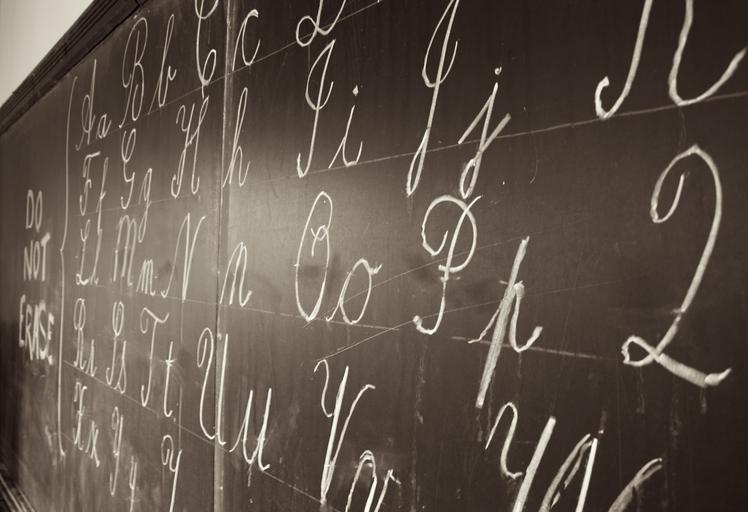 Keywords: blackboard writing chalk white letters alphabets cursive running words numbers surfaces chalkboard black and white flat smooth education classroom learning teaching schools