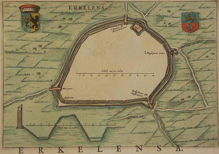 Keywords: Blaeu Erkelens.jpg Erkelens Fortification of the Town Erkelenz Novum ac magnum theatrum urbium Belgicae about 1650 Scanvorlage In Heimatkalender des Kreises Heinsberg 2003 circa 1650 Joan Blaeu 1596-1673 PD-old Maps by Willem and Johannes Blaeu Maps of Erkelenz Old maps of Kreis Heinsberg Upper Guelders Maps made in the 17th century